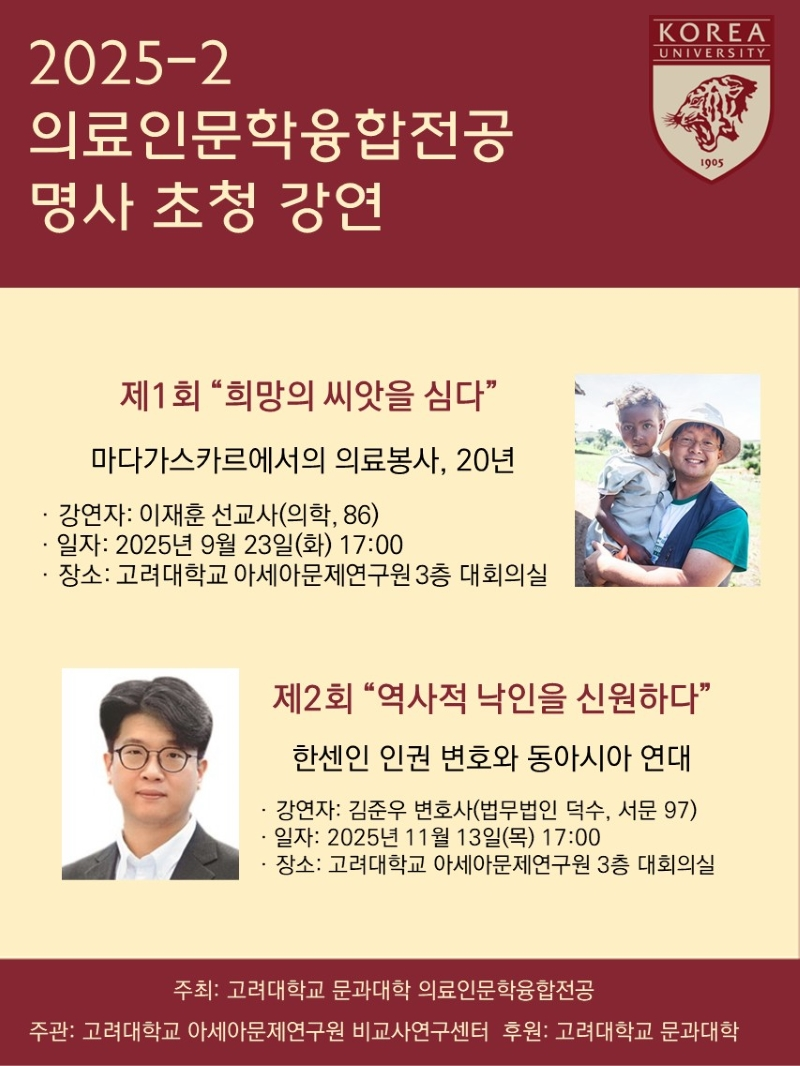 고려대학교 아세아문제연구원에서 개최하는 의료인문융합전공 제1회 명사초청 강연 관련 안내드립니다.