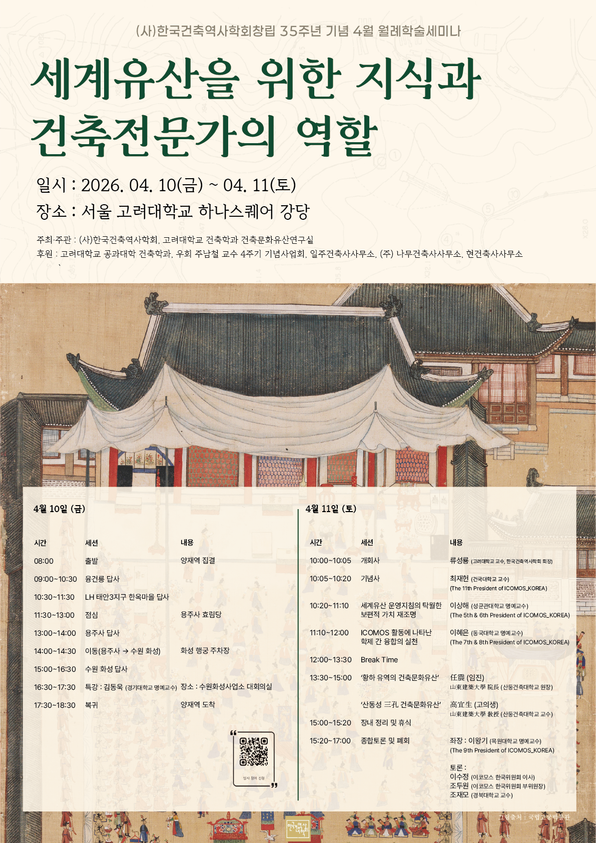 | 제목 | [한국건축역사학회] 한국건축역사학회 창립 35주년 기념 4월 월례학술세미나 <세계유산을 위한 지식과 건축전문가의 역할> |